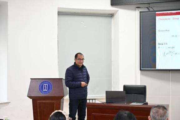 第四节报告由湖南城市学院周双双教授主持。大连理工大学王巍副教授作了题为《Maintenance of global boundedness for a 2D chemotaxis-Navier-Stokes system with strengthened cross-diffusion》的报告;大连理工大学郑斯宁教授作了题为《Remarks on Gravitational Potential Energy and First Cosmic Velocity of Earth》的报告。